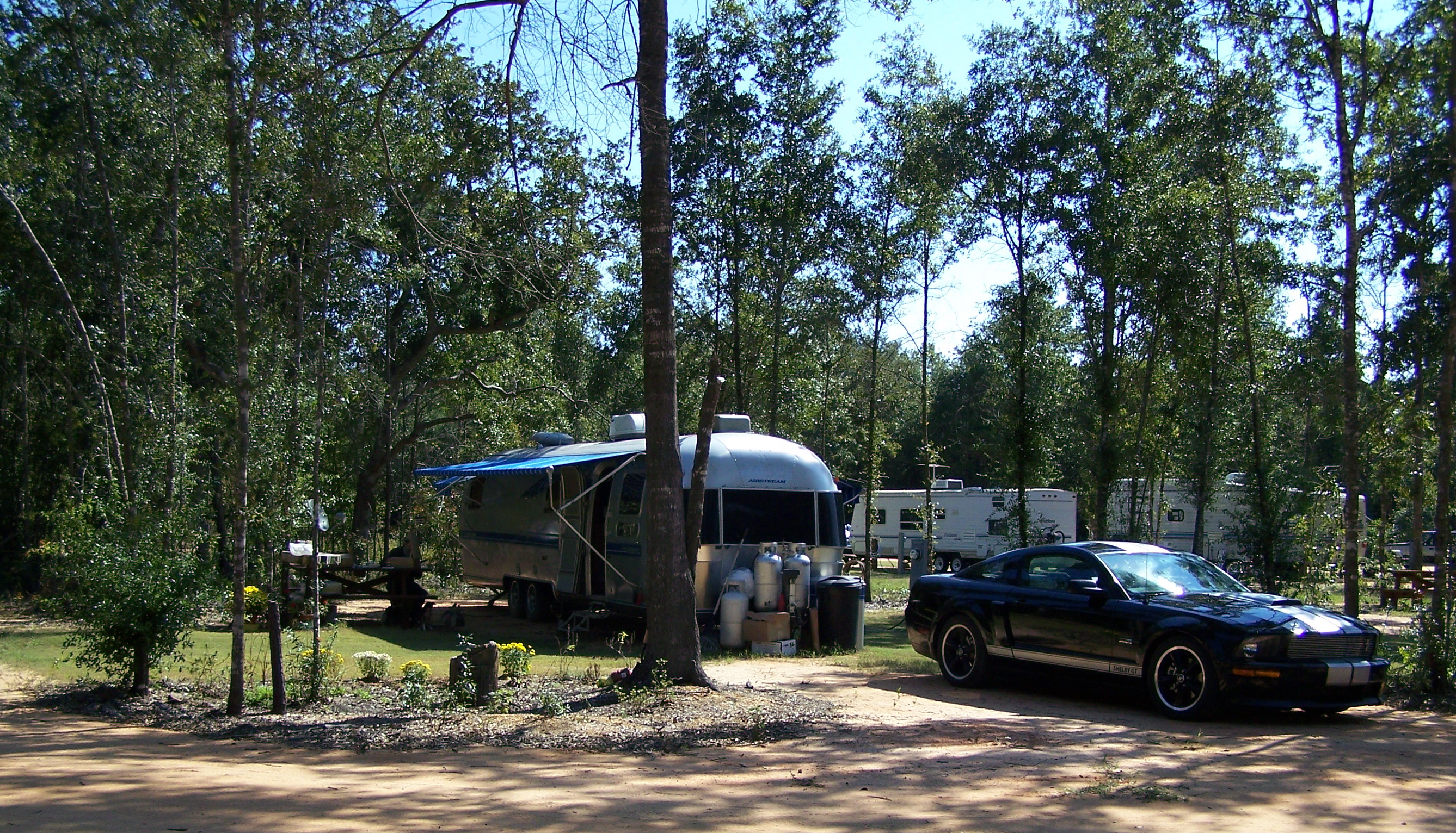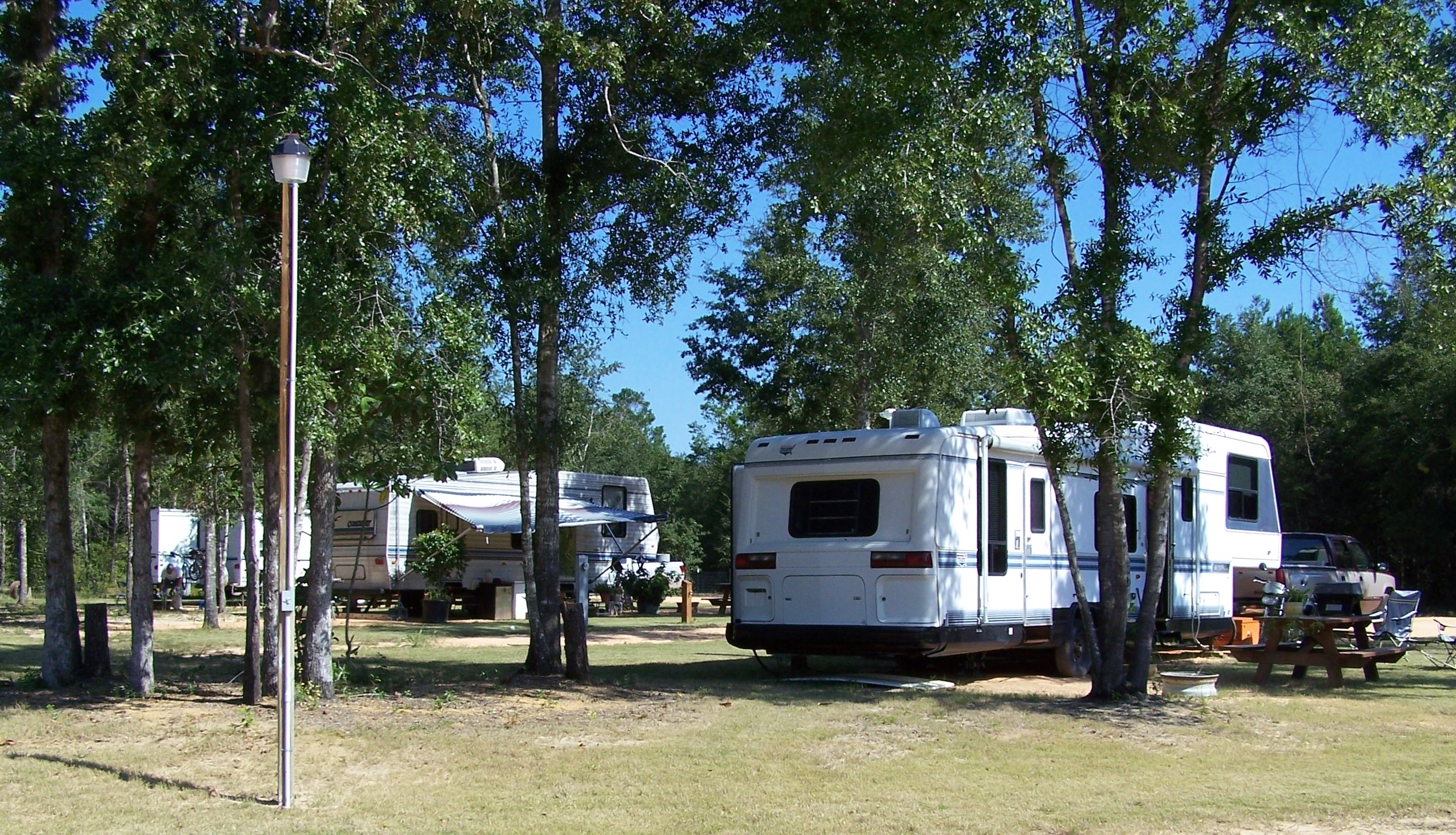 We invite you to visit our beautiful RV park. Our 24 RV sites (both pull-through and back-in), shaded by tall oaks, have grass side yards where you can cook out or just kick back. Many have picnic tables and fire rings for enjoying outdoor evenings. There are walking trails through acres of woods, and for those of you traveling with your "best friends", we have a dog run with an adjacent picnic area.